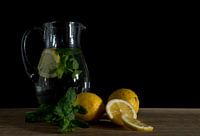 stilleven met een kan met water met mint en citroen met op de voorgrond verse citroen op zwarte achtergrond op houten tafel