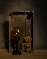stilleven met teddybeer en oude lamp in houten kistje op donkere achtergrond