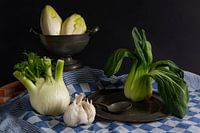 stilleven met groente, tinnen voorwerpen en blauwe doek