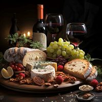 De compositie was compleet, en het tafereel straalde een uitnodigende en rustgevende sfeer uit. De wijn, kaas en brood waren niet alleen smakelijk om te eten, maar vormden ook een visueel feest voor het oog. De rijke kleuren van de wijn, de verschillende texturen van de kazen en het knapperige brood belichaamden de essentie van het Franse platteland.