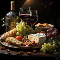 De compositie was compleet, en het tafereel straalde een uitnodigende en rustgevende sfeer uit. De wijn, kaas en brood waren niet alleen smakelijk om te eten, maar vormden ook een visueel feest voor het oog. De rijke kleuren van de wijn, de verschillende texturen van de kazen en het knapperige brood belichaamden de essentie van het Franse platteland.