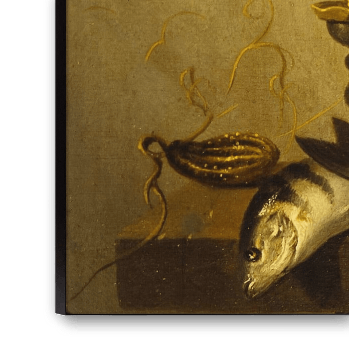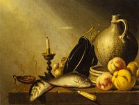 Digitale opname van een 17e. eeuws schilderij. voorstellend een stilleven voor het avondeten met vissen, een stenen kruik een kaars met standaard enkel vruchten en een mes met een ivoren heft