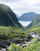 Vanuit een hoog standpunt ontvouwt zich een groen bergdal waarin rust en beweging samenkomen. De voorgrond, met rotsen en laag stromend water, vormt het anker van het beeld en nodigt de kijker uit om het landschap binnen te stappen. Vanuit daar leidt het oog langs het dal richting het water en de bergen in de…