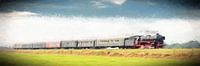 De stoomlocomotief 01 1075 met historische rijtuigen rijdt door een schilderachtig Hollandse landschap. Stoomlocomotief SSN 01 1075