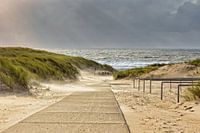 Een beeld van de Hollandse kust met een strandopgang tijdens een storm