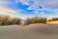 De kust met de Hollandse Duinen met zicht op de Noordzee bij een laagstaande zon in de winter. Het helmgras hier in het zonlicht.