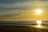 Op het Zeeuwse strand bij zonsondergang met meeuwen op de paaltjes.