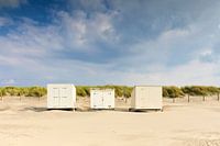 houten strandhuisje langs de Nederlandse kust met op de achtergrond de duinen en een dreigende wolkenlucht; 's-Gravenzande, Nederland