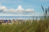 Typisch Nederlandse huisjes op het strand, achter de duinen met helm