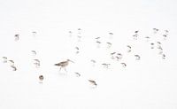 Steltlopers op het wad aan de kust bij Holwerd in Friesland. Tijdens eb komen ze massaal bij elkaar om op zoek te gaan naar eten. Door overbelichting komen ze prachtig uit in een witte achtergrond.