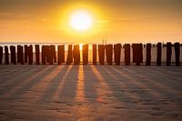 De strandhoofden op het strand van Vlissingen werpen hun schaduwen af doordat de ondergaande zon haar licht erop werpt. Dit zorgt voor langwerpige schaduwen waardoor er veel diepte in de foto komt.