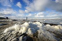 strandvisser aan zee en strand met een mooie blauwe lucht en schitterende witte wolken op een mooie ochtend in Katwijk