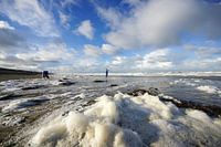strandvisser aan zee en strand met een mooie blauwe lucht en schitterende witte wolken op een mooie ochtend in Katwijk