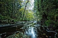 Een lange sluitertijd opname van de watervalletje in een Belgische rivier in het bos bij Hoëgne in de Ardennen.