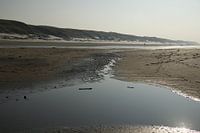 Bij laagwater stroomt het water in kleine stroompjes terug naar de zee. Kleine meertjes, pierenbadjes, blijven staan tot het weer hoogwater wordt. Het strand bij Hargen in Noord-Holland, Nederland
