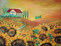 Een schilderij met acrylverf gemaakt van een zomers en warm tafereel in Italië... het is geen bestaande foto geweest , maar het doet denken aan Toscane... de sfeer, de zonnebloemen de bomen, het heuvelachtige en natuurlijk de warme tinten.....