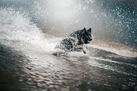 Een prachtig actie portret van deze stoere herdershond in het water. De druppels en spetters vliegen door het beeld. De kleuren maken het beeld afwisselend warm en cool waardoor deze in verschillende interieurs passend zal zijn, blauwe tinten en gouden, taupe, bruine tinten vormen de basis.