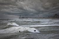 surfers op de Noordzee langs de kust van Scheveningen met een dreigende wolkenlucht en de Pier van Scheveningen op de achtergrond