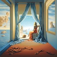 In een surrealistisch interieur, waar de grenzen tussen binnen en buiten vervagen, zit een vrouw in een vloeiende, oranjekleurige jurk op een stoel voor een open raam. Haar blik is gericht op de azuurblauwe zee die zich uitstrekt tot aan de horizon. Aan haar voeten ligt een slapende kat, terwijl buiten bizarre rotsformaties uit het…