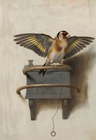 Een meesterlijk geschilderde distelvink (putter) spreidt zijn indrukwekkende vleugels uit terwijl hij op een grijze houten kast of vogelkastje staat. De vogel toont zijn karakteristieke roodgekleurde gezicht en geel-zwarte vleugelpatroon in volle glorie. Aan de kast hangt een subtiele ketting met ring, wat een interessant contrast vormt tussen vrijheid en gevangenschap. Een parodie op 't Puttertje van Carel Fabritius.