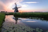De poldermolen 't Witte Lam tijdens zonsondergang. Deze molen is gebouwd in 1860 en de kleinste poldermolen van de provincie Groningen.