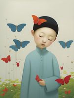 een foto van een kind omringd door blauwe en rode vlindertjes, kijkend naar een van de rode vlindertjes in zijn linkerhand.