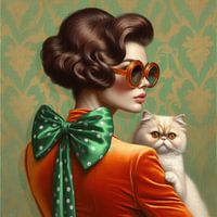 Een vrolijk, chique, retro en modieus portret van een vrouw met een kat.