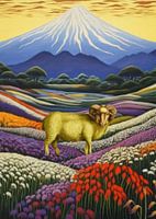Een zomers landschap in herfsttinten met een schaap, een berg, glooiende heuvels, in de verte een waterpartij en bloemen, veel bloemen.