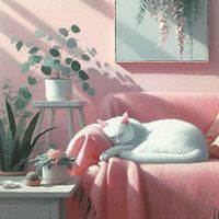 Portret van een slapende kat, op een sofa met roze plaid.