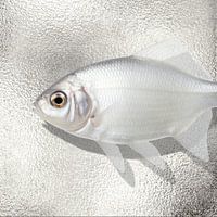 Een wit-zilveren goudvis op een zilveren achtergrond.