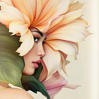 Dit is een betoverend en surrealistisch kunstwerk dat de schoonheid van de natuur combineert met een elegant vrouwelijk portret. De afbeelding toont een jonge vrouw in profiel, wiens haar en hoofd op een fantasierijke manier verweven zijn met een grote, lichtroze bloem en een weelderig groen blad.