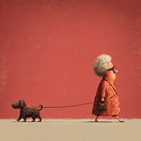 we zien een dame , met haar hondjes onderweg. Ze hebben beide een andere richting in gedachten
