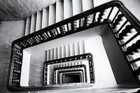 Trappenhuis in een woning in Lissabon, Portugal. Korrelige film noir bewerking. Rechthoekige trap met versierde houten leuning.