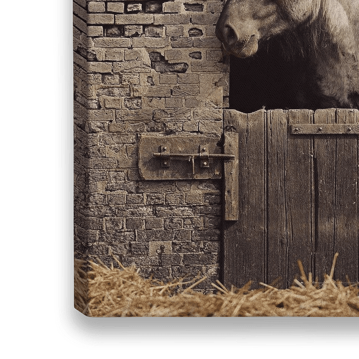 Koop de foto trekpaard op stal... van Els Fonteine op canvas, aluminium dibond, (ingelijste) fotoprint, behang en ArtFrame, op maat geprint in Fine-Art kwaliteit.
