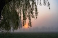 landschap in Homoet, Gelderland, waar een dikke mist over het weiland hangt, en de zon opkomt tussen de takken van de treurwilg