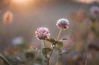 close up van de trifolium hybridum, een wildgroeiend zomers bloemetje, met het zachte licht van de opkomende zon