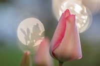 close up van drie tulpen, van groot naar klein, met een groen blauwe achtergrond, en met schaduw in de bokeh ringen