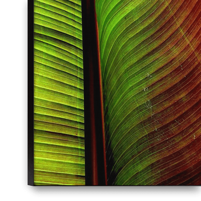 Een artistieke close-up van grote, symmetrisch gerangschikte bladeren, waarvan de structuur en het kleurenspel indrukwekkend zijn geënsceneerd. De bladeren van een bananenboom hebben groene tinten die aan de randen vervagen naar dieprode tinten. De sterke, heldergroene delen staan in schril contrast met de bijna kastanjekleurige delen,…