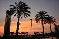 tropishe palmbomen onder een prachtige zonsondergang in de kust van het Peruaanse miljoenen stad Lima, prachtige oranje en grijs blauwe tinten die met elkaar een mooi foto maken