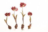 tuintje van gedroogde rode tulpen.Compositie van vier rode gedroogde bloemen op witte ondergrond. Sierlijke gedroogde tulpen. Vergane natuur op helder wit. Bloemenkunst.