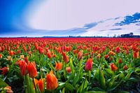Een traditioneel Hollands tulpenlandschap. Door het gebruik van een groothoekobjectief ontstaat een weids beeld. De blauwe lucht geeft een mooi contrast met de rode bleomen.
