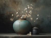 turquoise vaas | Turquoise Bloom - Dit bloemen schilderij toont een grote turquoise vaas gevuld met tedere witte bloemen aan dunne bruine takken in een rustige japandi-stijl tegen een zacht, donkergrijze achtergrond met een klein donker lidded potje naast de vaas — schilderij bloemen, bloemen schilderij, stilleven met bloemen voor…