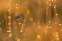 2 heideblauwtjes in tegenlicht met dauwdruppels.