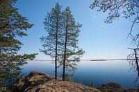 twee kerstbomen op een steen op een achtergrond van blauw water scandinavië, karelia
