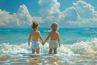 zomers tafereel van achter aanzicht van twee kinderen op het strand in de branding kijkende richting de horizon. ai kunstmatige intelligentie ,computer gegenereerd beeld