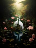 Twee kraanvogels staand in een meertje. Omringd door roze bloemen.