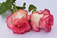 macro foto van twee rozen in de kleuren roze en wit voor een witte achtergrond