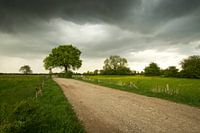 Met een flauw zonnetje en dreigende wolken werd het landschap lang rivier De IJssel, (Gorssel, Nederland) weer heel anders. De boterbloemen geven een kleurig geheel!! De dreigende, dynamische wolken zijn een mooie toevoeging.