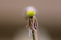 macro opname van een uitgebloeide herfstanemoon, met hangende bloemblaadjes en grijze achtergrond