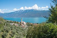 uitzicht van boven op het Gardameer, Monte Baldo berg, Gargnano dorp met kerk, landschap italië